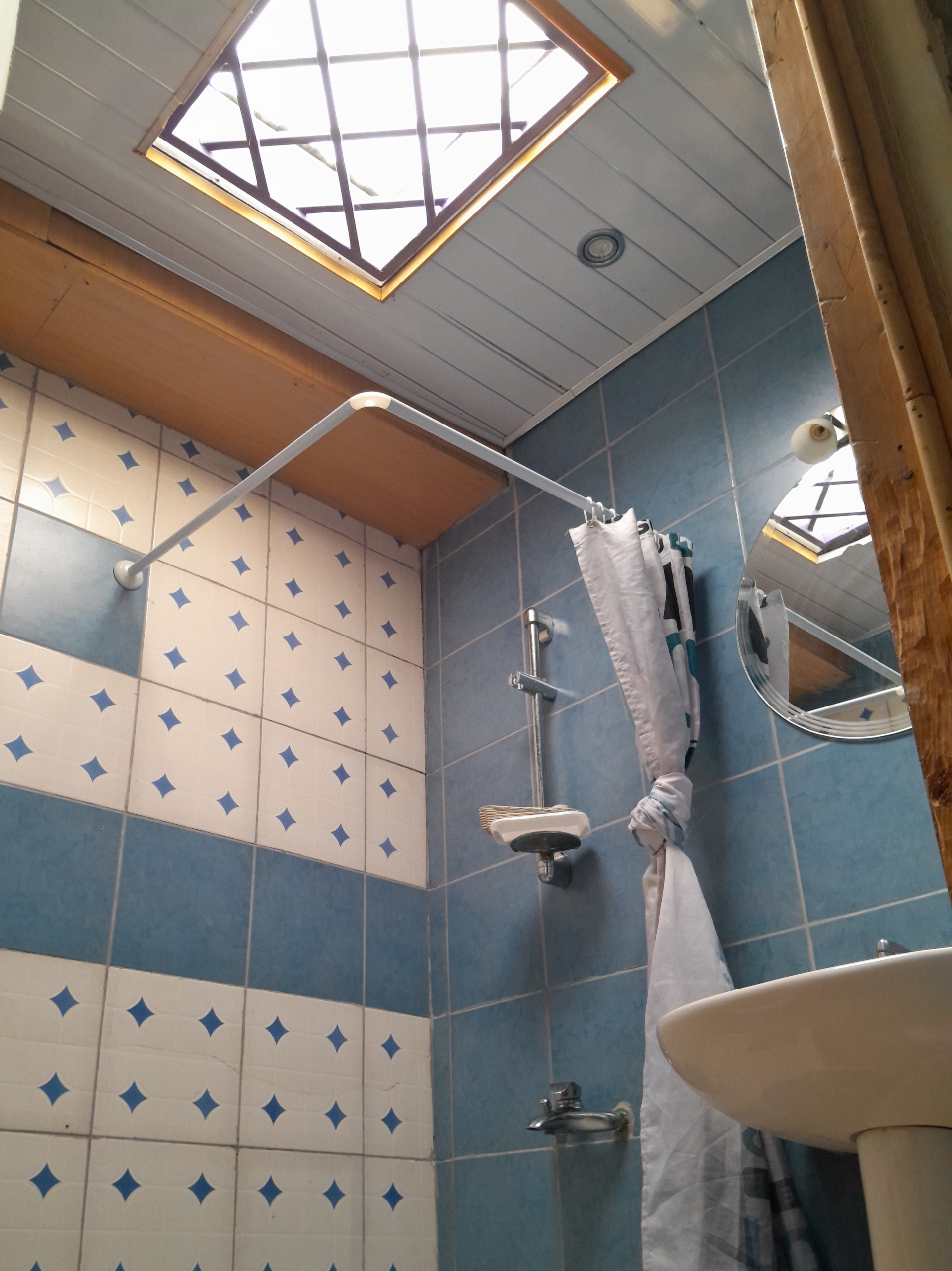 - The shared bathroom has a skylight, promising an experience worth remembering.